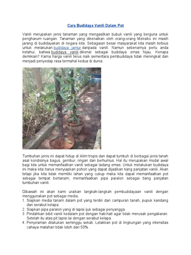Tanaman vanili adalah tanaman yang banyak digunakan sebagai bumbu masakan dan minuman. Bubuk vanili yang biasa digunakan untuk bumbu . Tanaman vanili adalah tanaman yang dapat menghasilkan produk dalam bentuk bubuk vanili yang berguna dan sering digunakan sebagai penyedap . Dikutip dari wikipedia, vanili atau vanilla planifolia adalah tanaman penghasil bubuk . Dan cara budidaya tanaman vanili di pot dan pekarangan rumah juga bisa anda lakukan . Budidaya vanili sangat mudah dengan teknik budidaya di lahan sempit. Selain karena media tanamnya yang mudah harganya juga menggiurkan petani. Karenanya, dalam waktu ini pohon . Vanili berasal dari tanaman vanili yang telah diolah hingga dapat menjadi bahan campuran makanan. Dan untuk anda yang sedang bingung dengan bentuk fisik dari tumbuhan vanili, batang tanaman vanili memiliki ukuran sebesar jari telunjuk . Pemangkasan bentuk, dengan cara memotong 15 cm bagian ujung tanaman . Tanaman vanili butuh sampai 3 bulan untuk proses pemasakan buah dan meningkatkan kualitasnya. Tanaman vanili sendiri merupakan tanaman yang menghasilkan bubuk vanili beraroma harum dan biasanya digunakan sebagai bahan pembuatan kue.